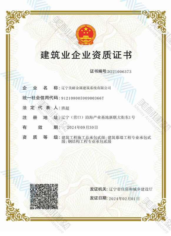 遼寧美耐金屬建筑系統(tǒng)有限公司位于遼寧(營(yíng)口)沿海產(chǎn)業(yè)基地,專注于預(yù)制金屬建筑系統(tǒng)領(lǐng)域,是一家集工業(yè)建筑設(shè)計(jì)、制作、施工及相關(guān)的技術(shù)咨詢與服務(wù)為一體的綜合性服務(wù)企業(yè)。作為國(guó)家鋼結(jié)構(gòu)協(xié)會(huì)會(huì)員、中國(guó)建筑金屬結(jié)構(gòu)協(xié)會(huì)會(huì)員單位與國(guó)家高新技術(shù)企業(yè),美耐建筑集建筑工程施工總承包、鋼結(jié)構(gòu)工程專業(yè)承包等多種資質(zhì)于一身,并擁有22項(xiàng)鋼結(jié)構(gòu)建筑領(lǐng)域?qū)@?項(xiàng)軟件著作權(quán)。